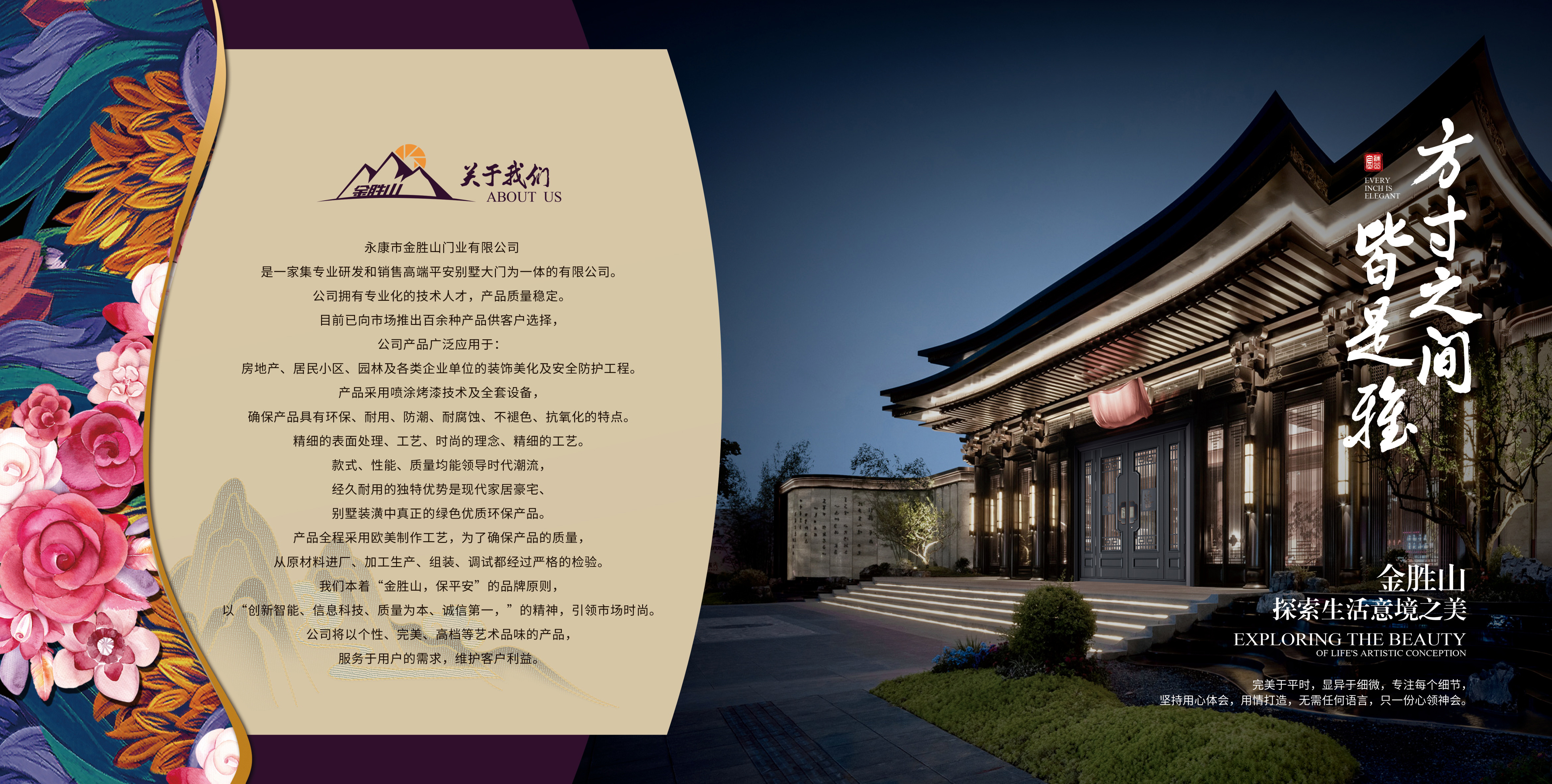 浙江金勝山門業(yè)有限公司是一家專業(yè)研發(fā)和銷售高端平安別墅大門為一體的有限公司。公司擁有專業(yè)化的技術人才,產品質量穩(wěn)定。目前已向市場推出百余種產品供客戶選擇,公司產品廣泛應用于:房地產、居民小區(qū)、園林及各類企業(yè)單位的裝飾美化及安全防護工程。